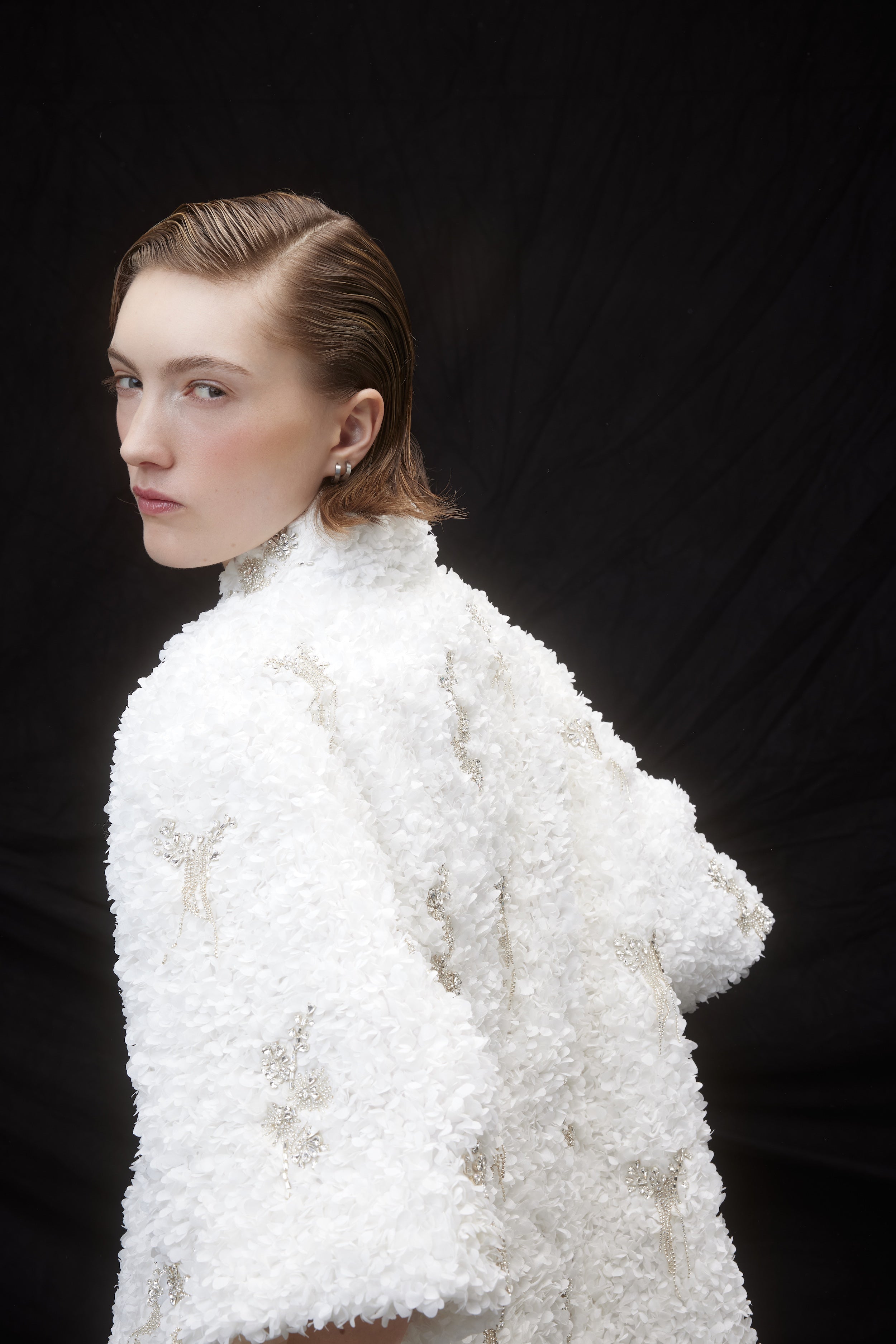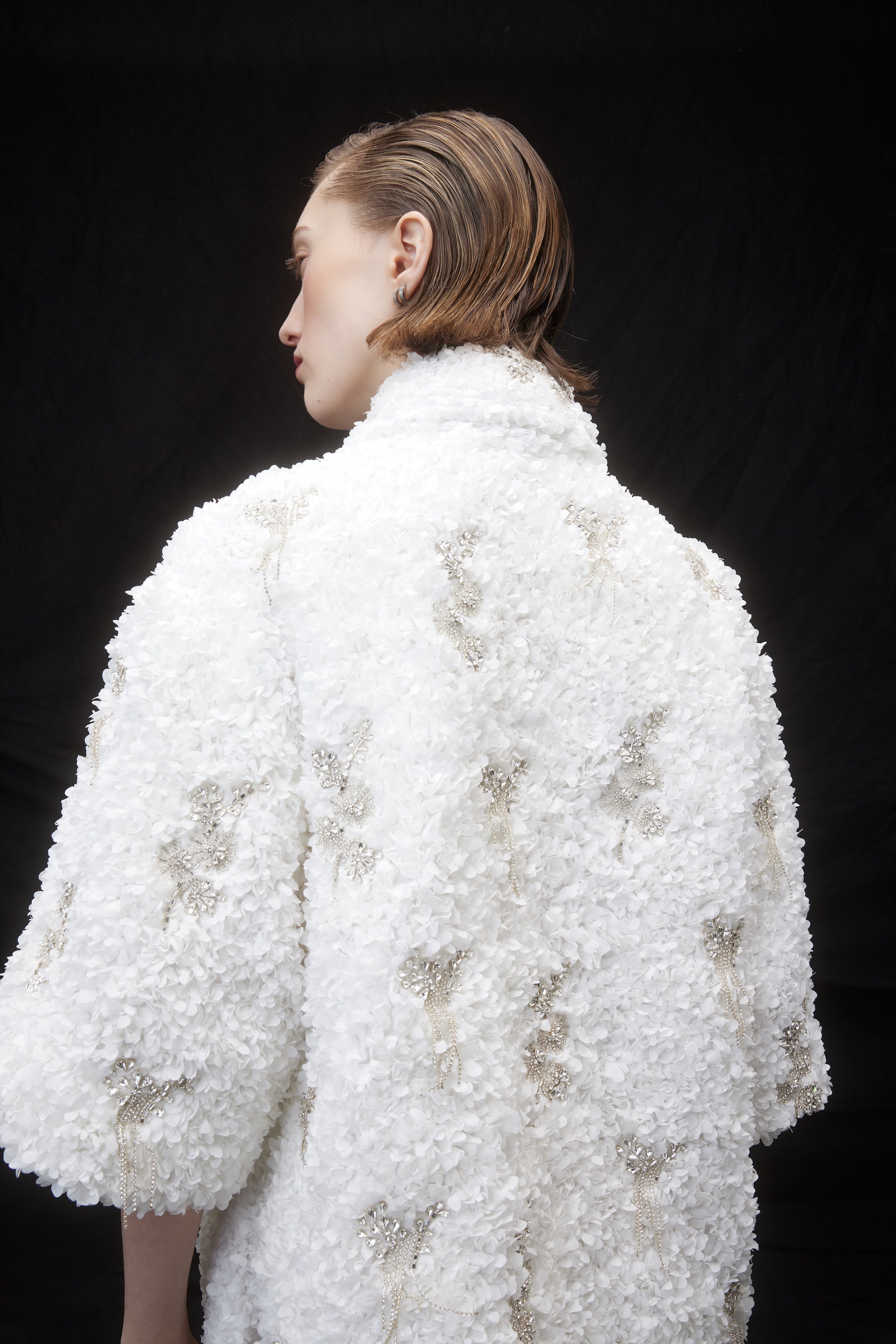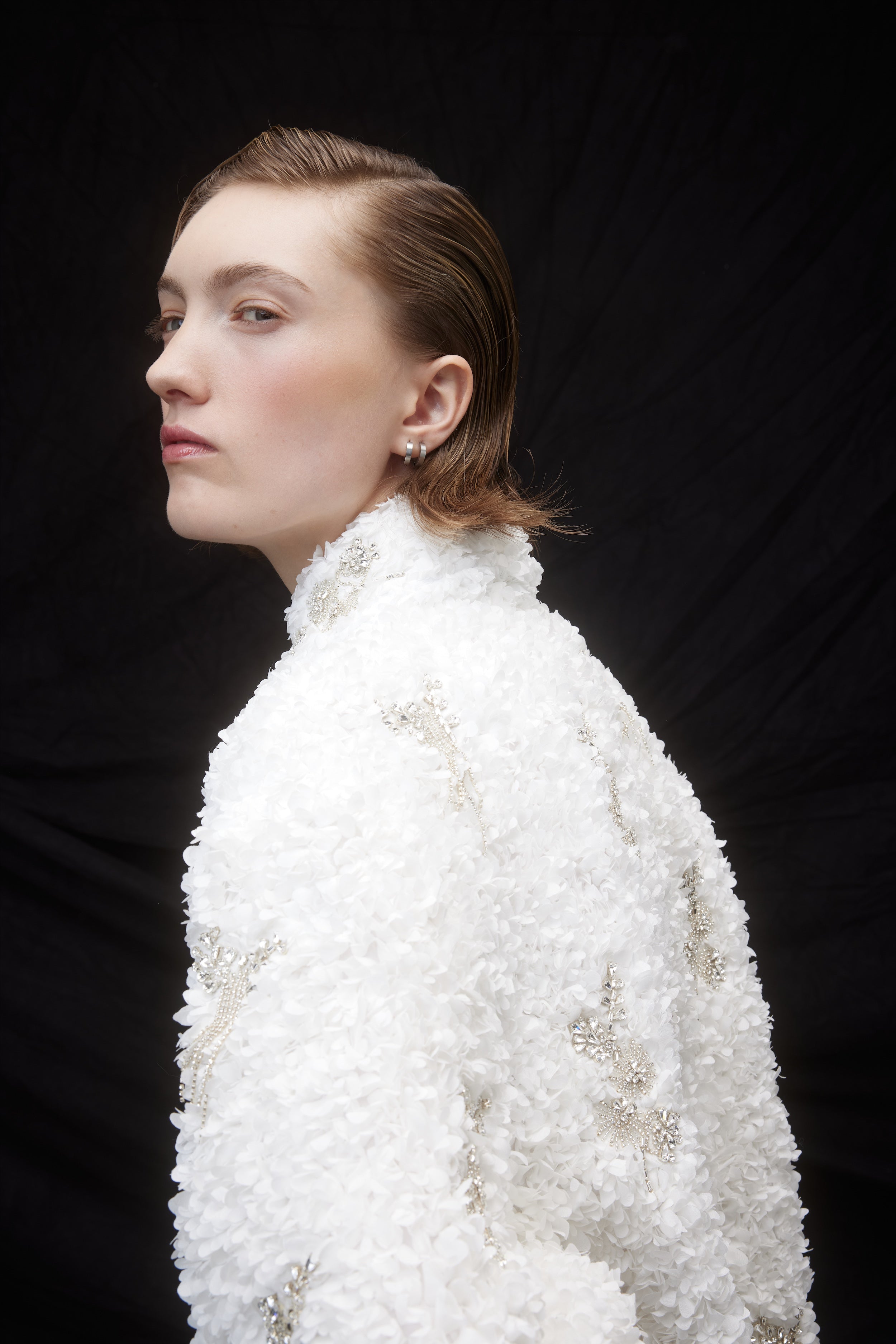 The pièce de résistance of the collection. This statement piece is crafted from a Spanish textile created by a family-owned mill established in 1940, composed of individually cut floral petals and adorned with hand-embroidered with Preciosa® crystals - renowned for their brilliance and craftsmanship. Designed to be worn as a shirt or outer shell, it captures the balance between delicacy and structure.
