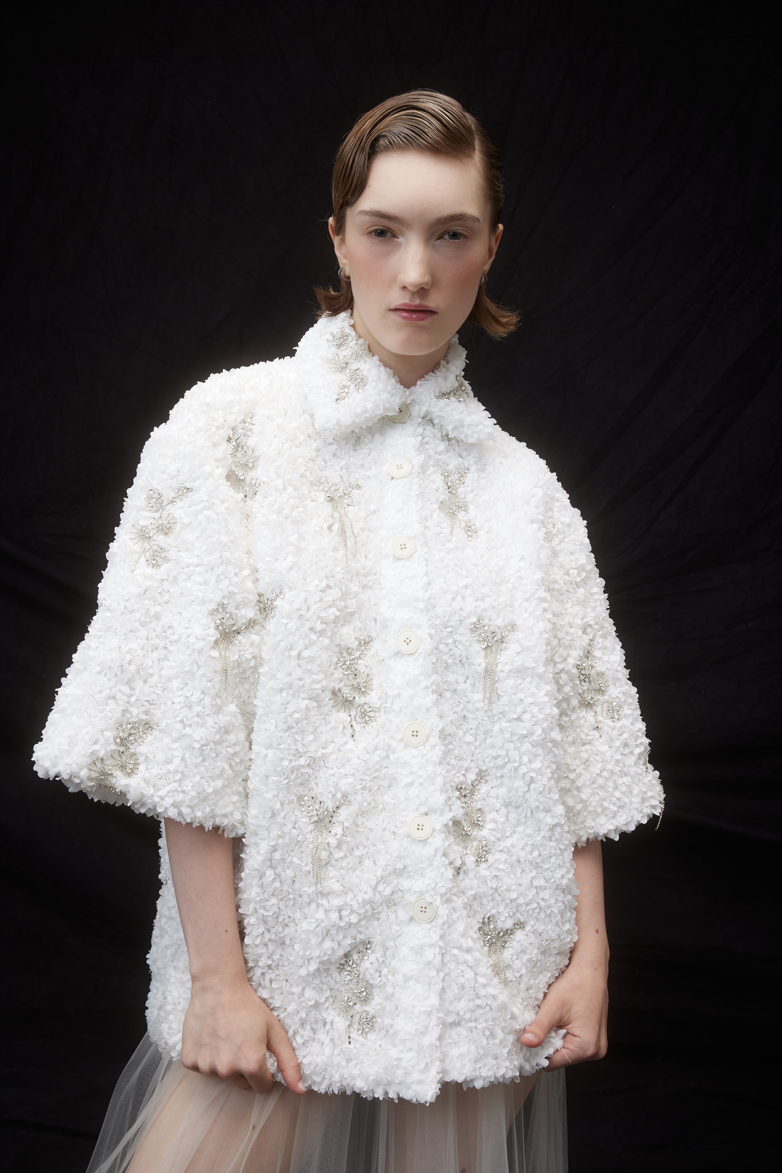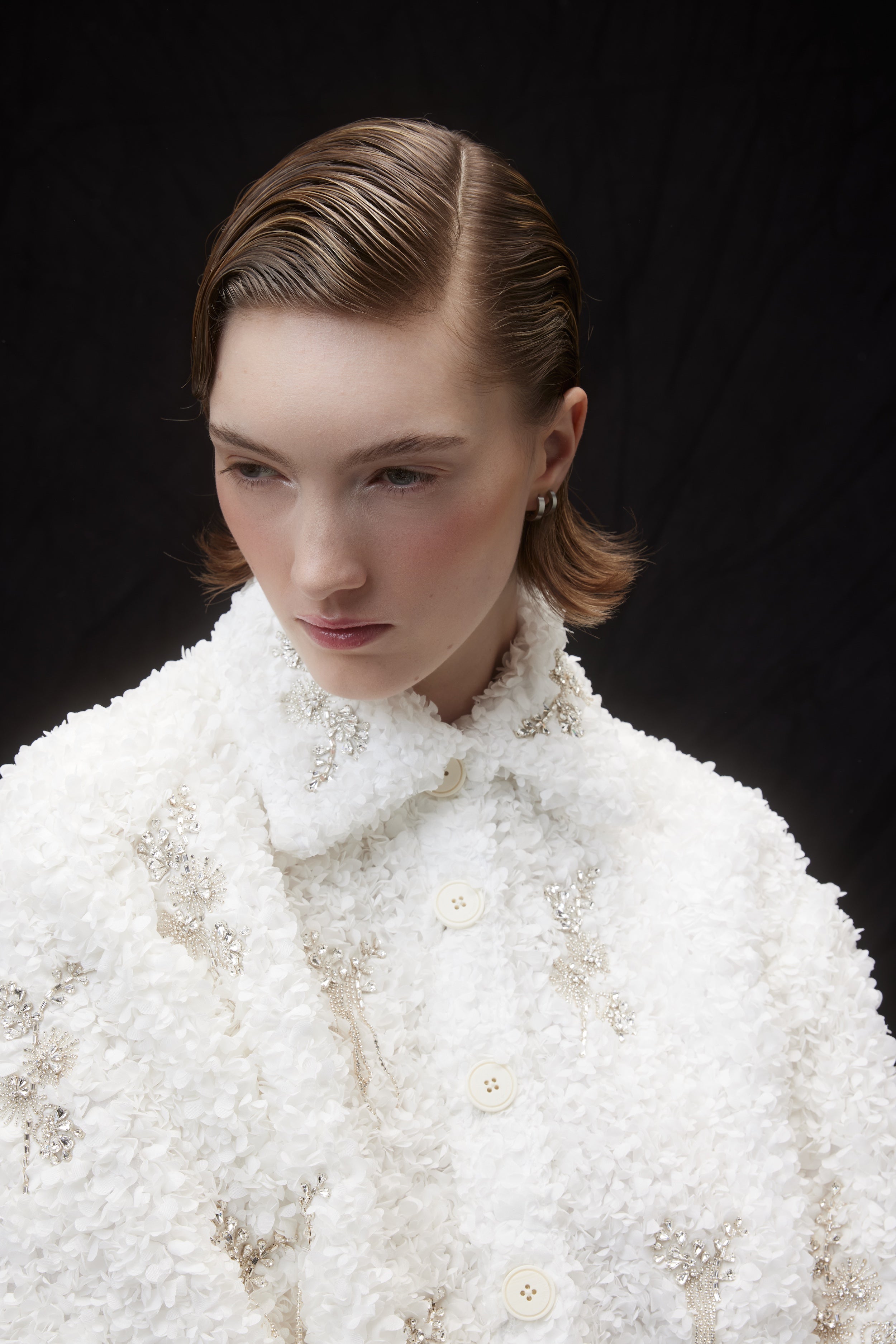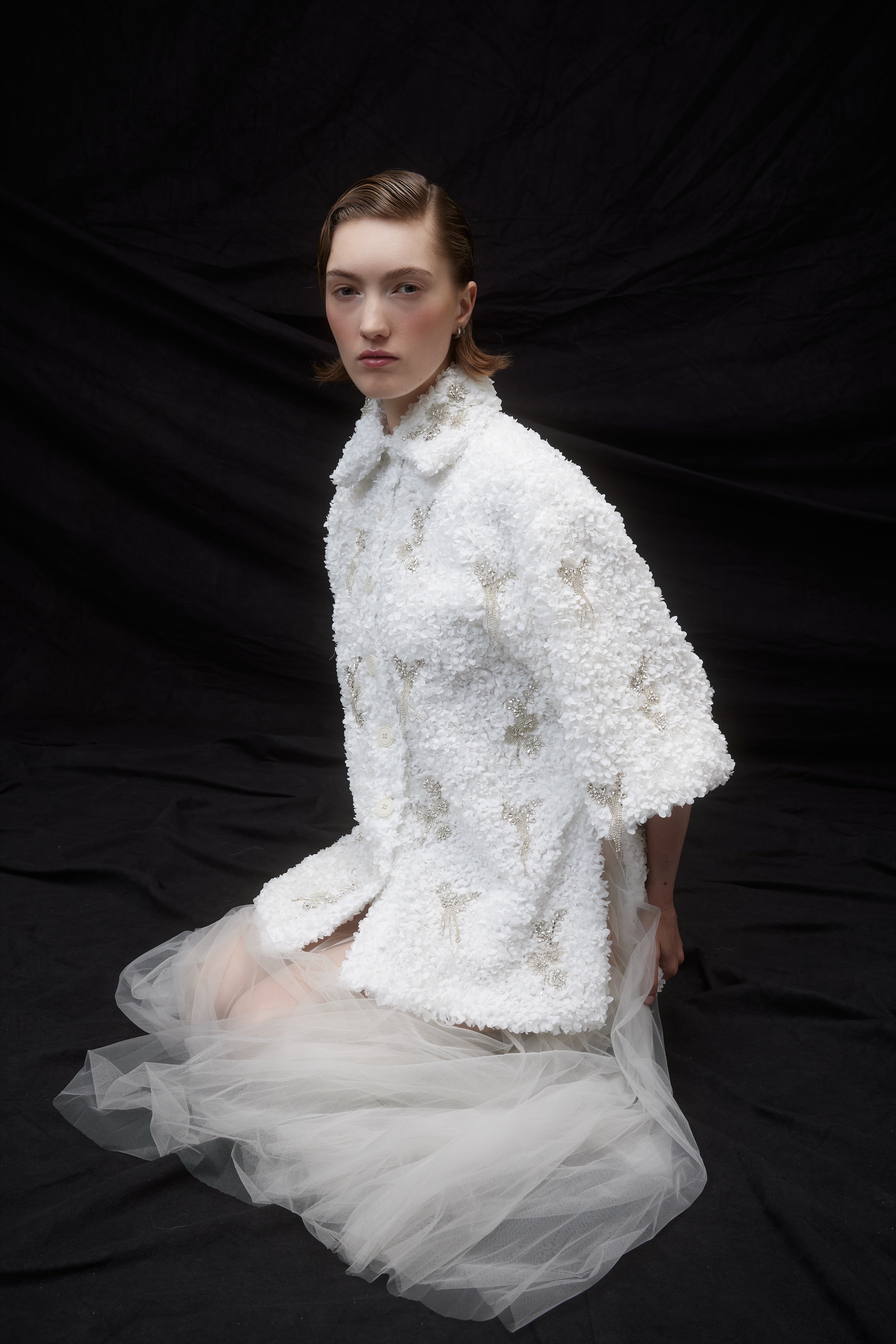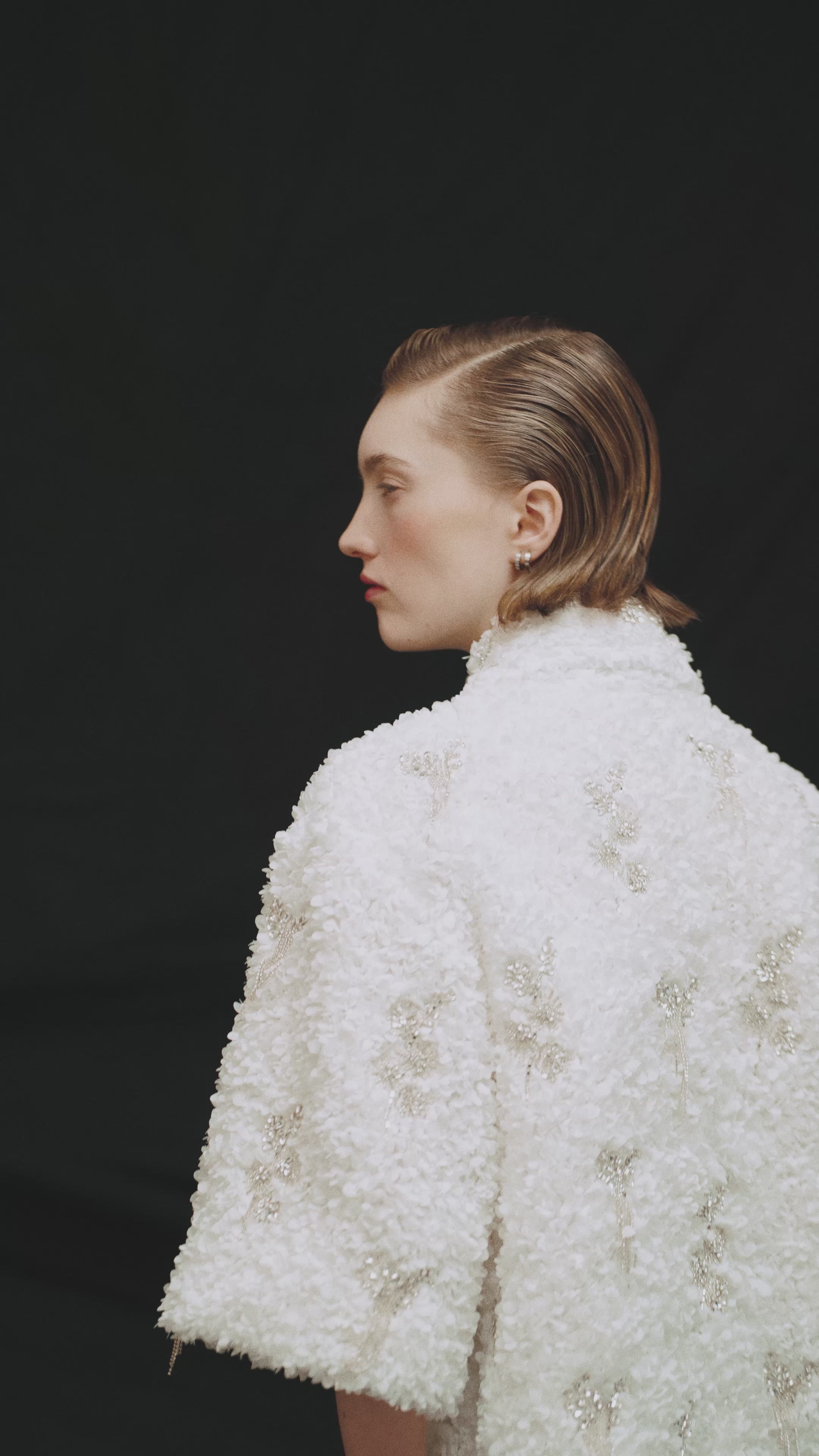 The pièce de résistance of the collection. This statement piece is crafted from a Spanish textile created by a family-owned mill established in 1940, composed of individually cut floral petals and adorned with hand-embroidered with Preciosa® crystals - renowned for their brilliance and craftsmanship. Designed to be worn as a shirt or outer shell, it captures the balance between delicacy and structure.