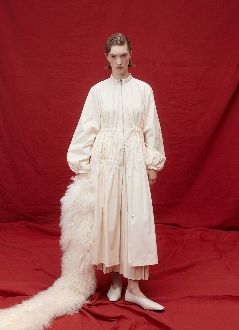 Featuring a cinched waist and flattering midi length, this skirt is crafted from wrinkle-resistant Italian wool suiting for effortless polish. A two-way metal zipper adds refined detail and versatile functionality, making it both elegant and practical for sophisticated wardrobes.